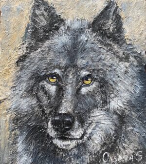 # 115. Wolf. 22×19. Acryl. Altholz. Mischtechnik. Sold