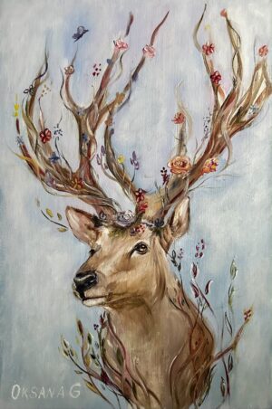 # 123. Rothirsch. Weidenkönig. 60×40. Acryl. Öl. Leinwand. Sold