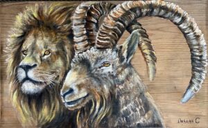 # 93 Löwe und Steinbock 61 x 38. Öl. Holz. Mischtechnik. Sold