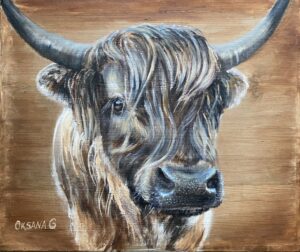 #71 Das Schottische Hochlandrind 61×50. Öl. Holz. Sold