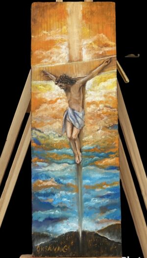 #74 Jesus- Brücke zwischen Himmel und Erde. 33×11. Öl. Holz. Sold
