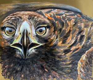 # 96. Der freie Adler. 46×40. Acryl. Goldfolie. Altholz. Mischtechnik.