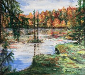 # 98. Herbst in den Alpen. 30×27. Öl. Altholz. Mischtechnik.