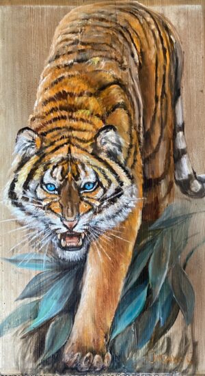 # 106. Tiger. 61×31. Öl. Altholz. Mischtechnik. Sold